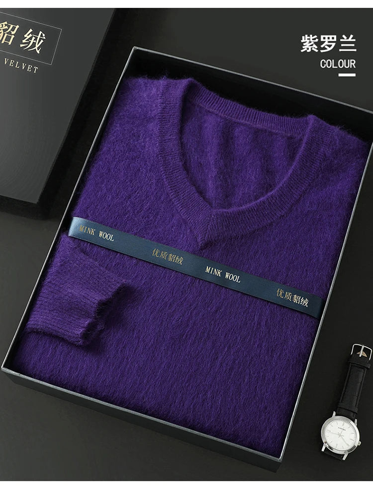 100% Pure Mink Cashmere Knitted Pullover Men's V-Neck Loose Large size Sweater Business Casual Warm Thick Bottoming Shirt Autumn