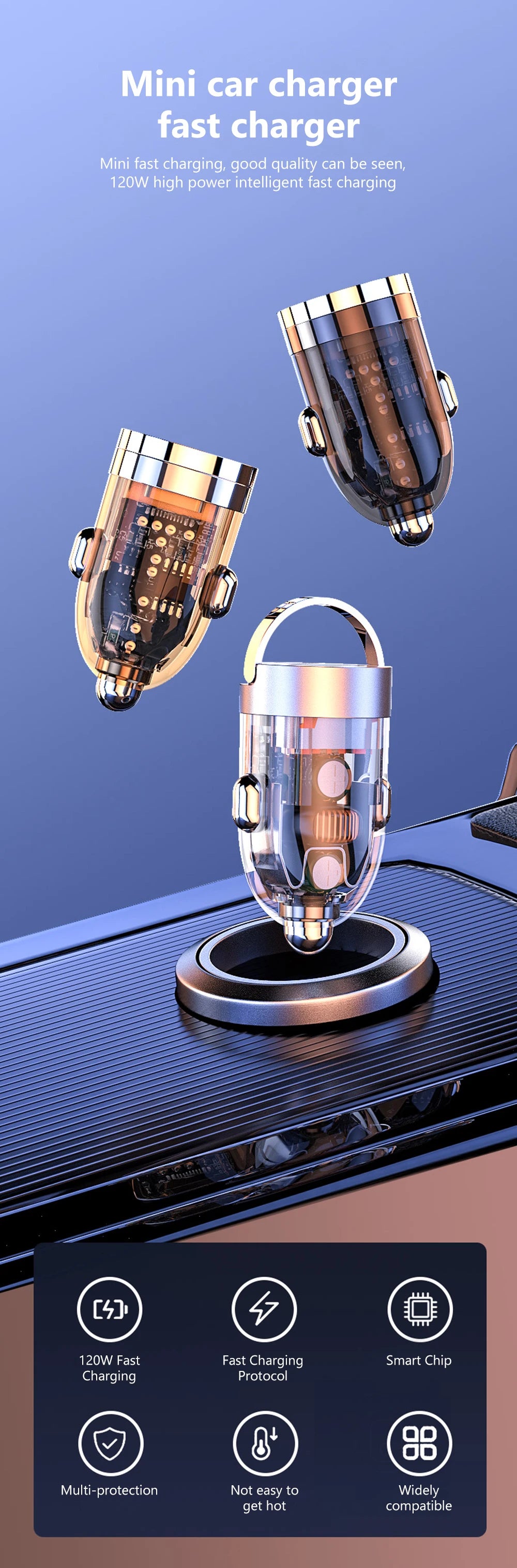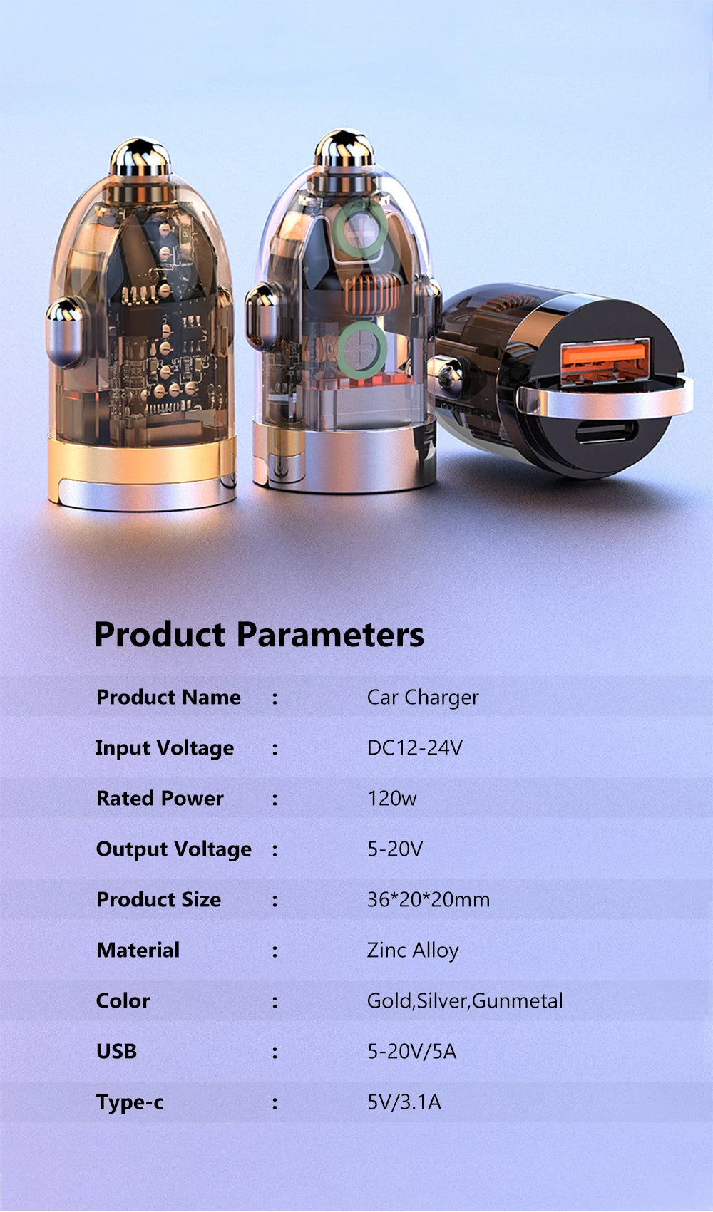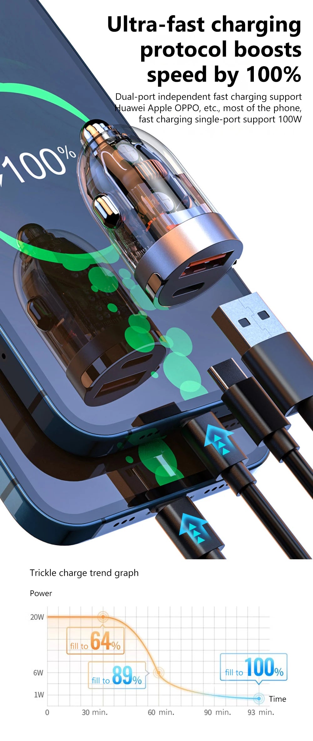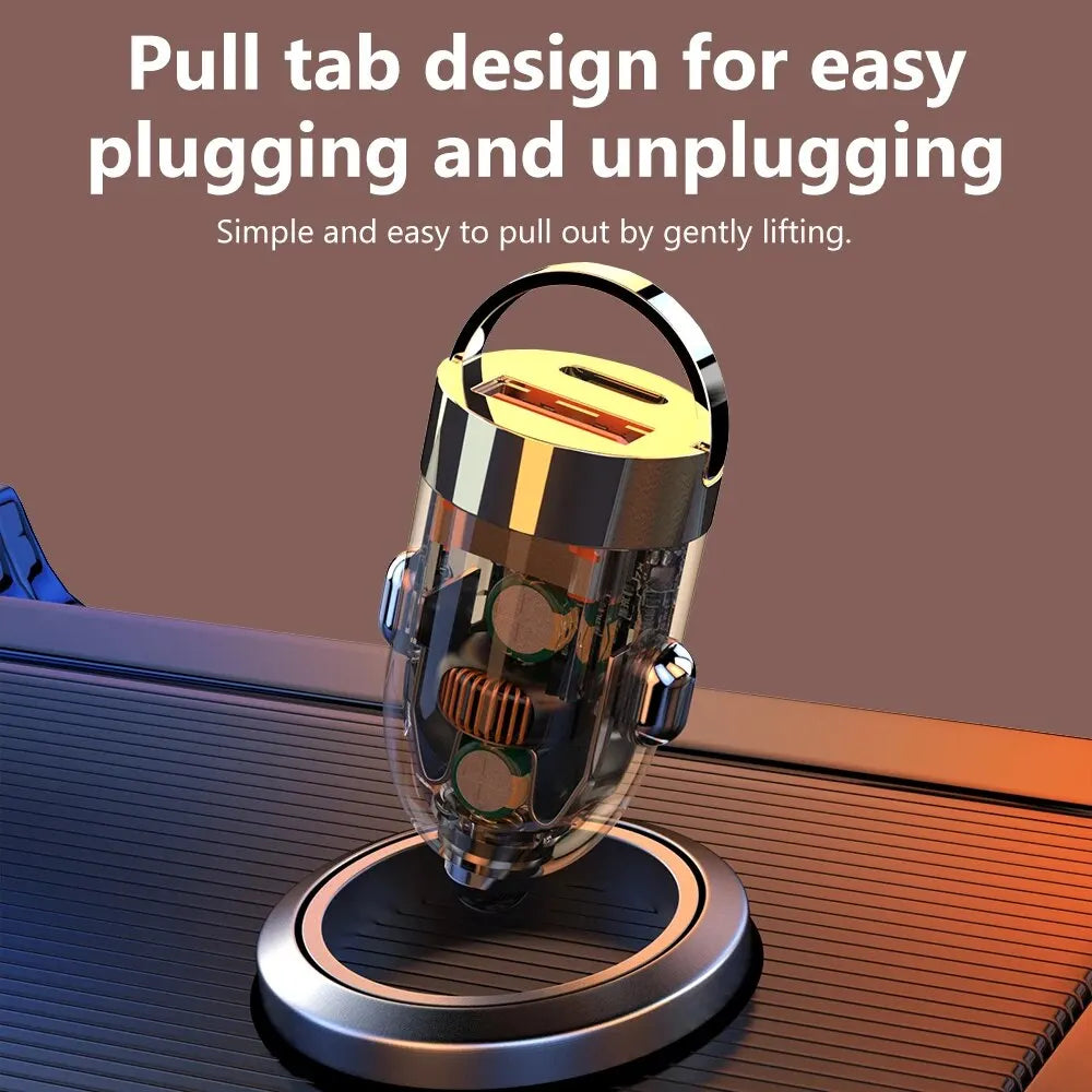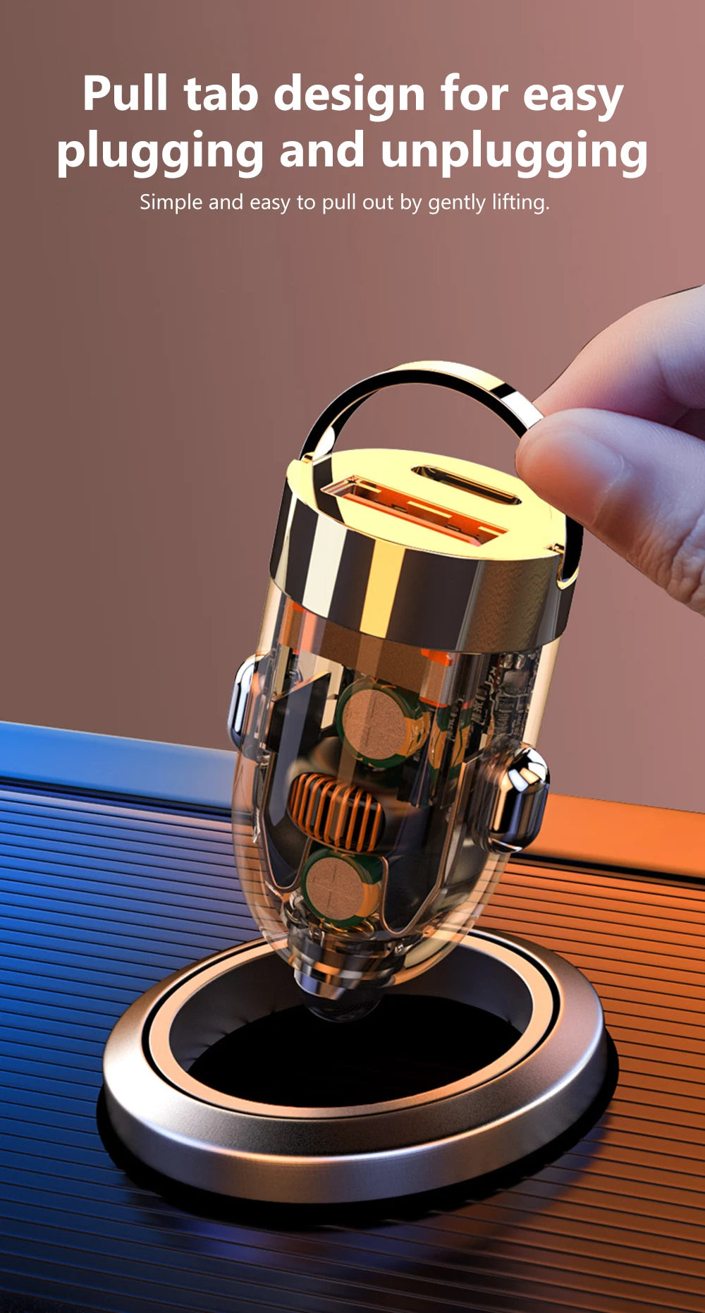 120W Transparent Invisible Pull Ring Car Charger USB Type C Fast Charging QC3.0 PD Phone Charger for iPhone Xiaomi Samsung
