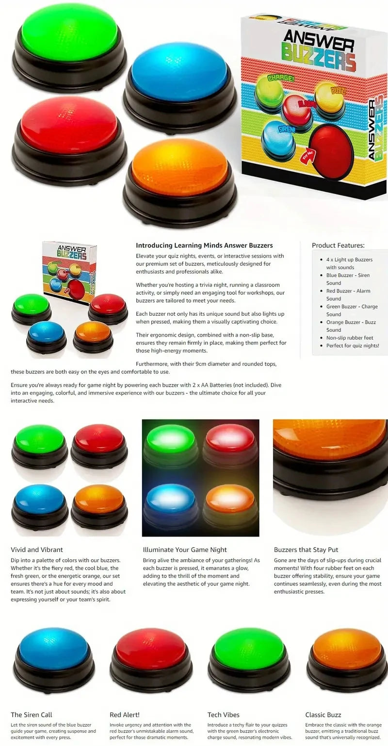 Answer Buzzers for Game Shows 4pcs Game Buzzers with Lights & Sounds Buzz Buttons for Kids or Adults Perfect for Classroom Game