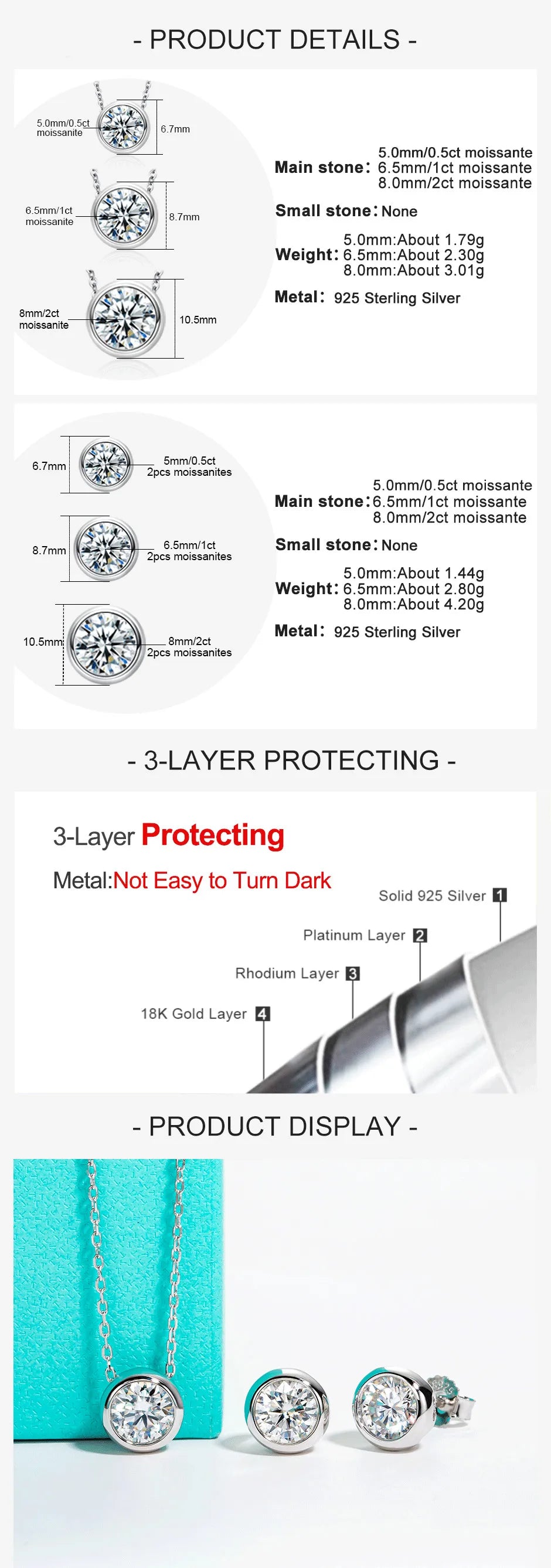 AnuJewel D Color Moissanite Bezel Stud Earrings 18K Gold Plated Pendant Necklace 925 Sterling Silver Jewelry Set Customs Jewelry