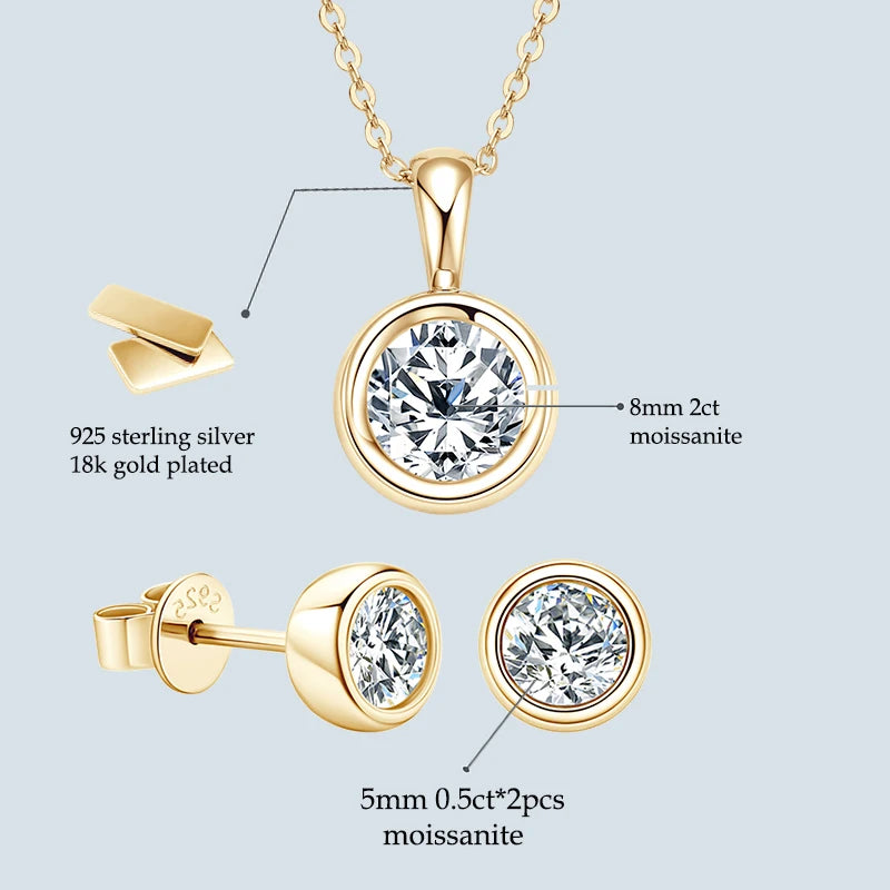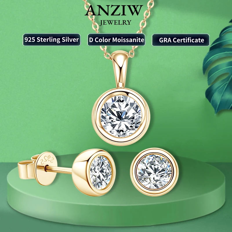 Anziw 925 Silver Set 2ct Moissanite Pendant Necklace 1ct 0.5ct Stud Earrings 18K Gold Plated Jewelry Sets for Women Wedding Gift