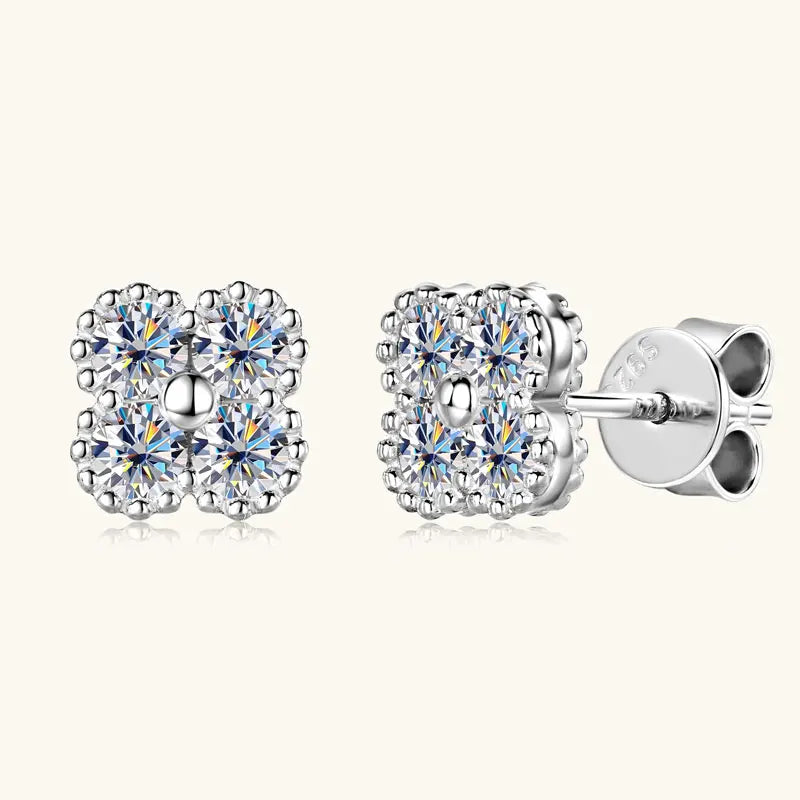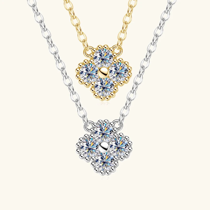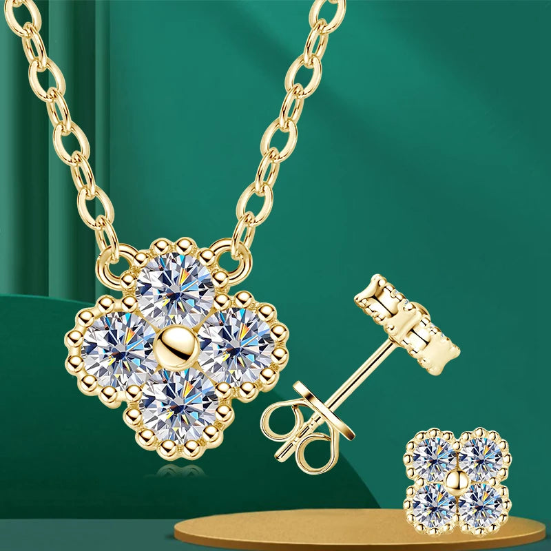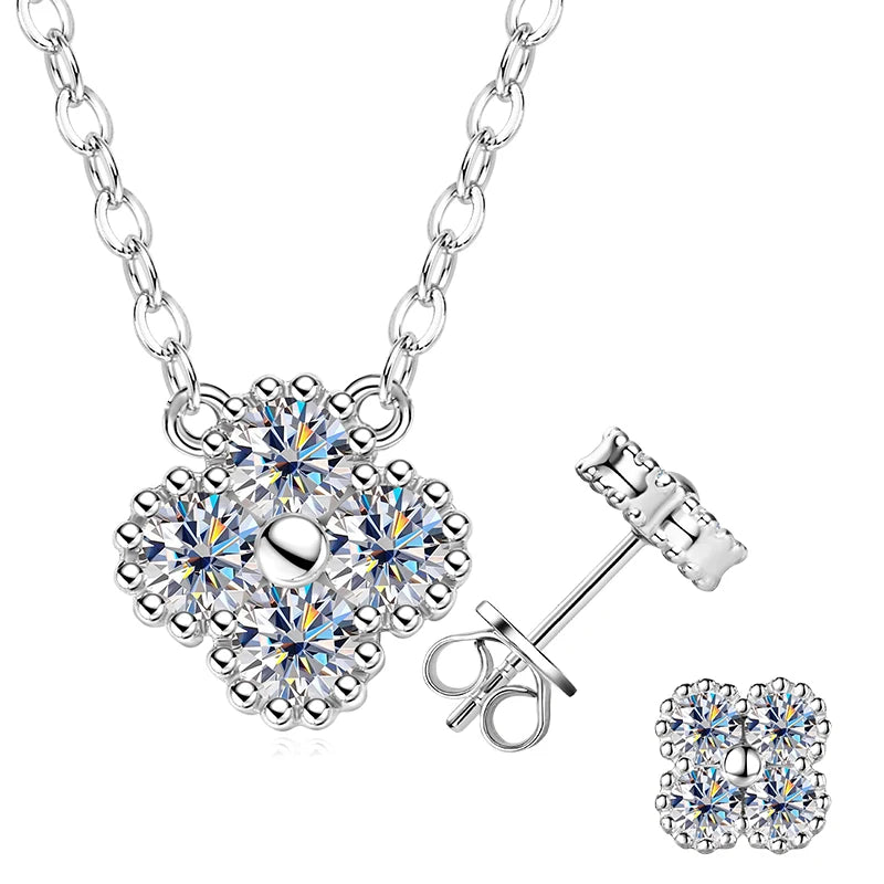 Lnngy 925 Certified Silver Chains Four Leaf Flower Pendant Necklaces 3mm 0.1ct Moissanite Necklace Stud Earring Jewelry Set