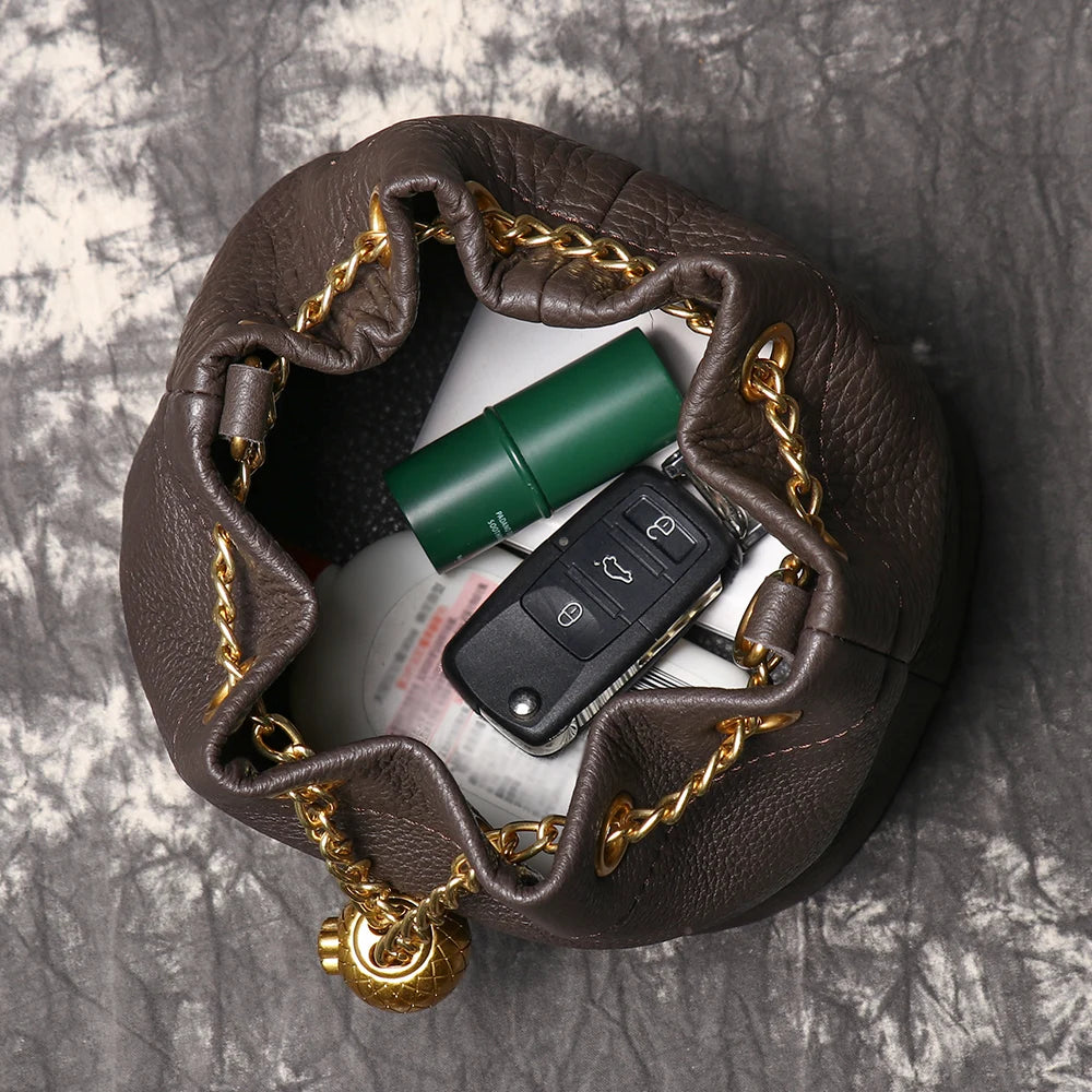 LUOKIR New Metal Drawstring Versatile Women's Handbag Genuine Leather Chain Crossbody Bag Vintage Bucket Bag Mobile Phone Bag