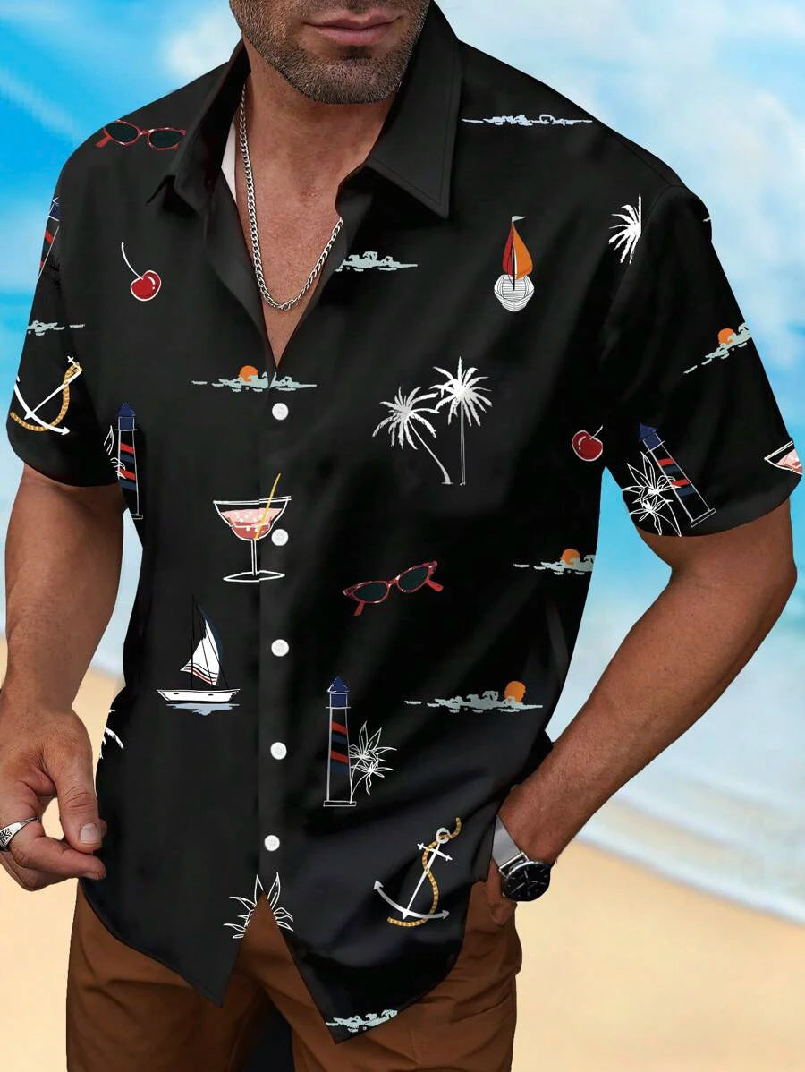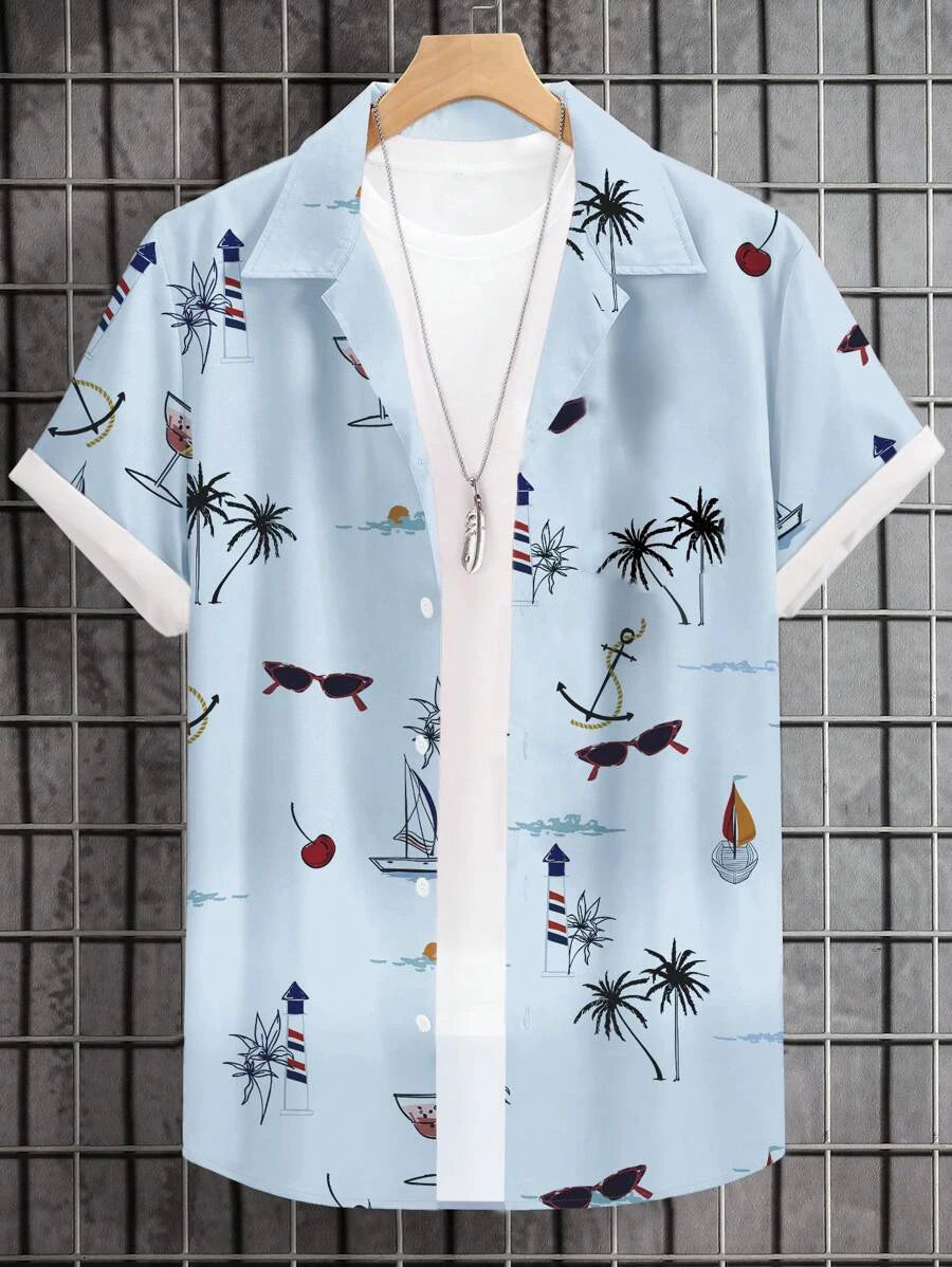 Men's Woven Fashion Casual Beach Surf Holiday Palm Tree Pattern Slim Fit Short Sleeve Shirt