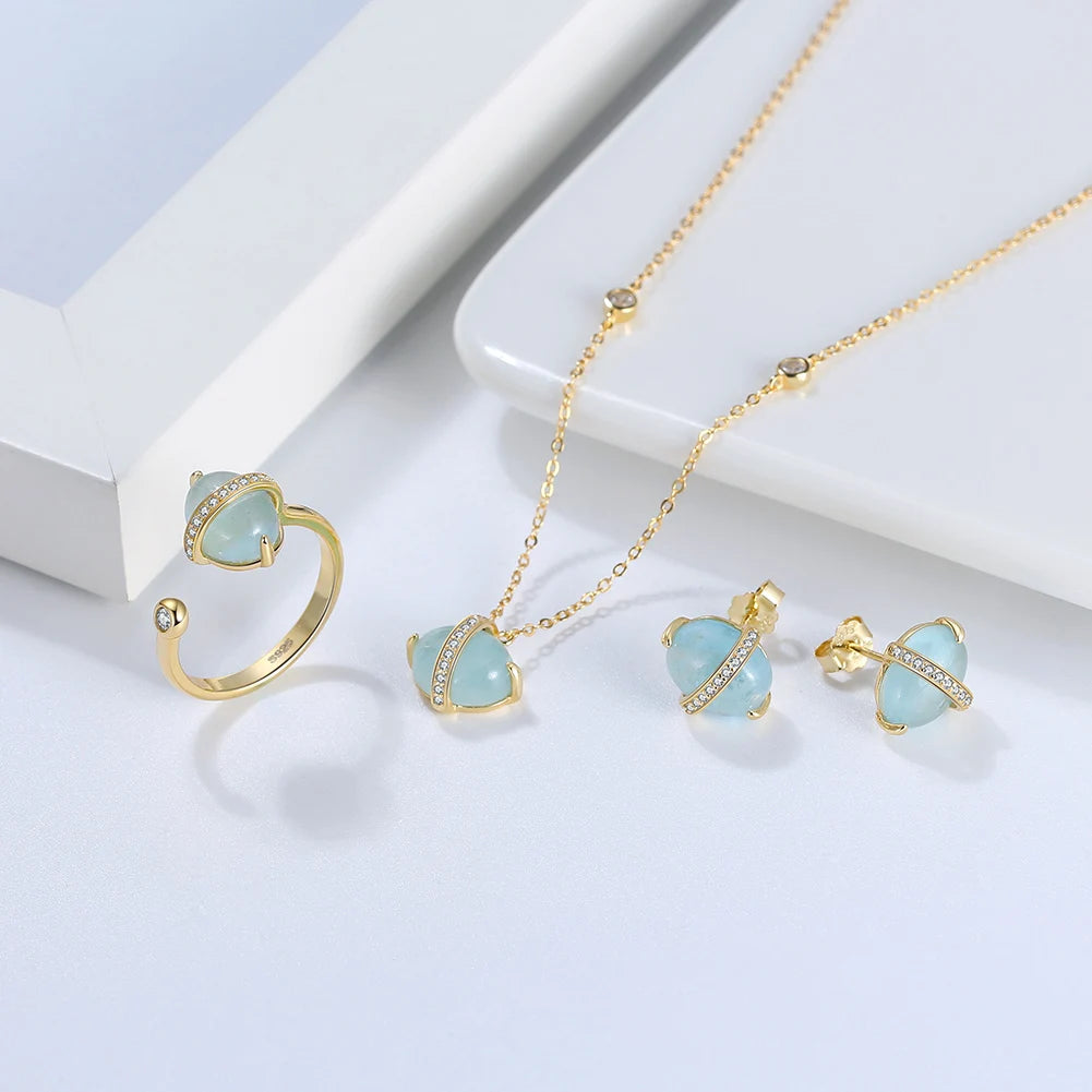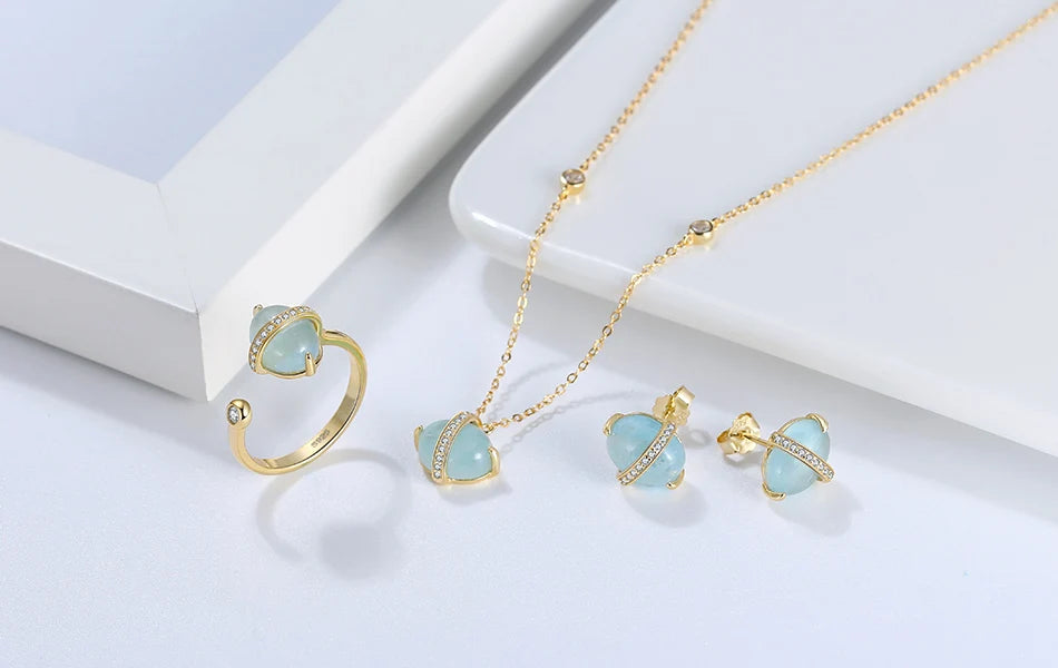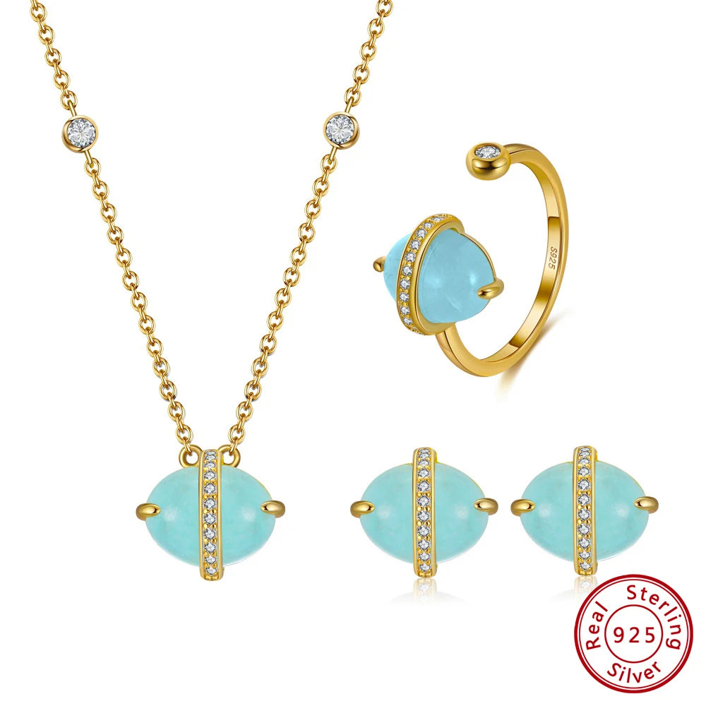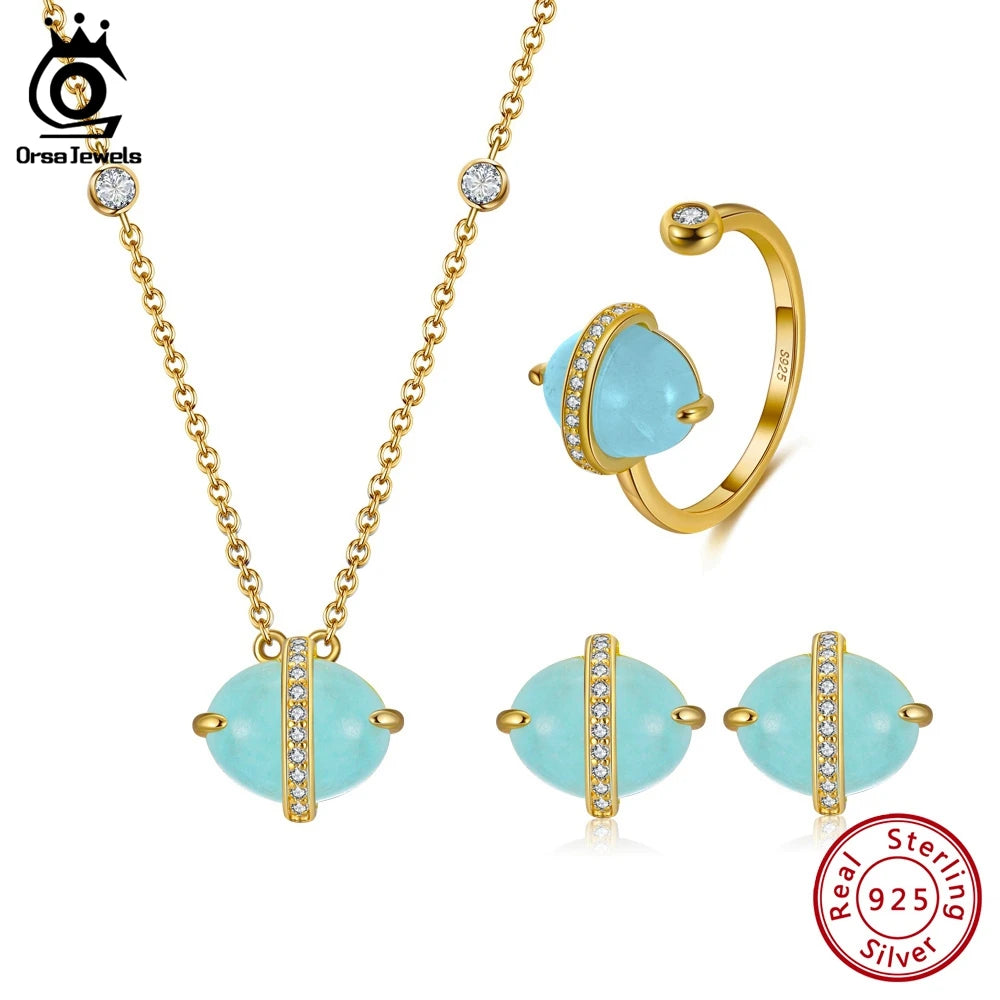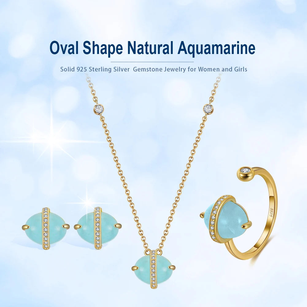 ORSA JEWELS 925 Sterling Silver Natural Aquamarine Earrings Necklace Ring Set 14K Gold Plated for Women Jewelry Sets Gift SSGM04