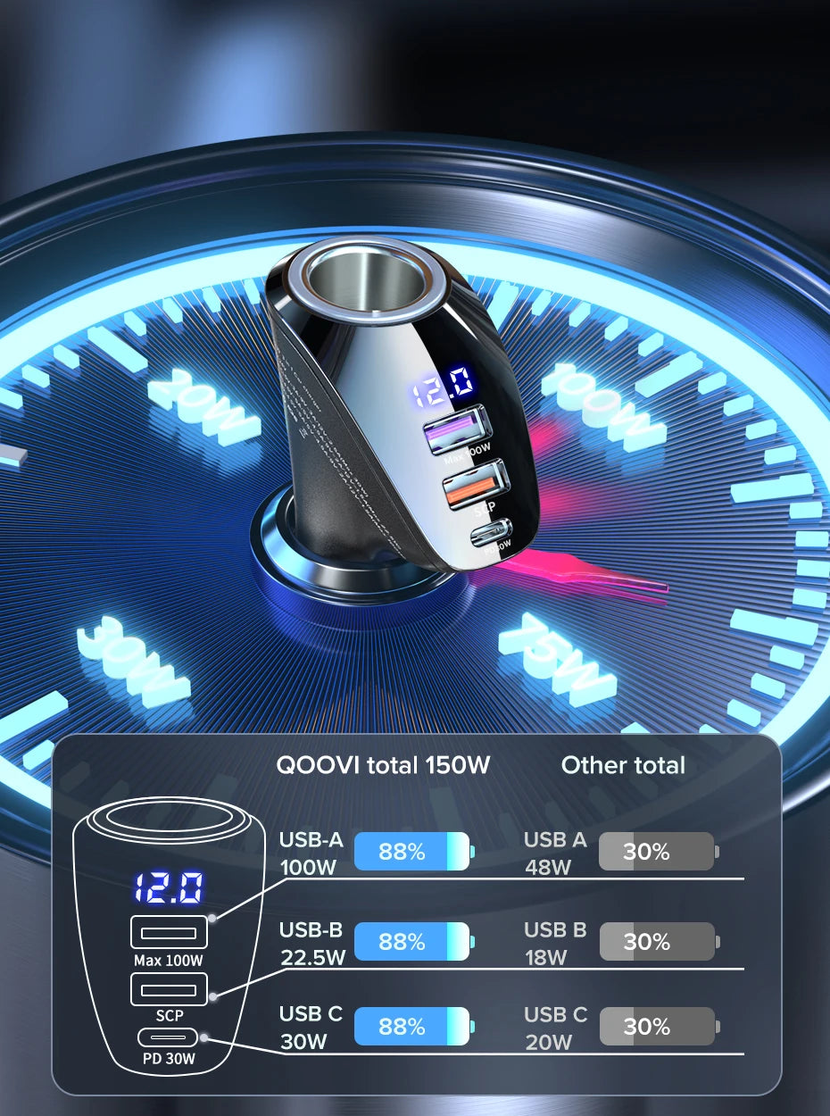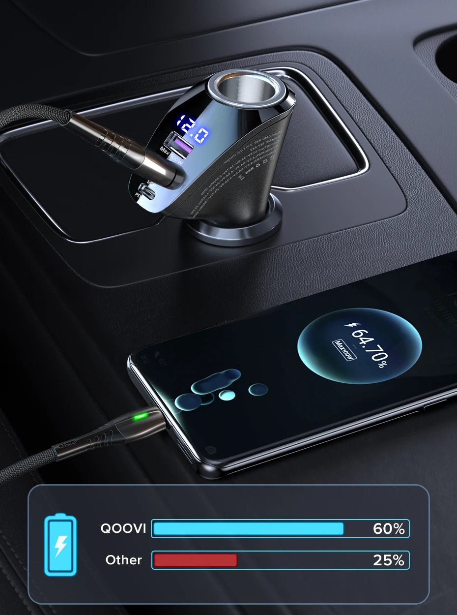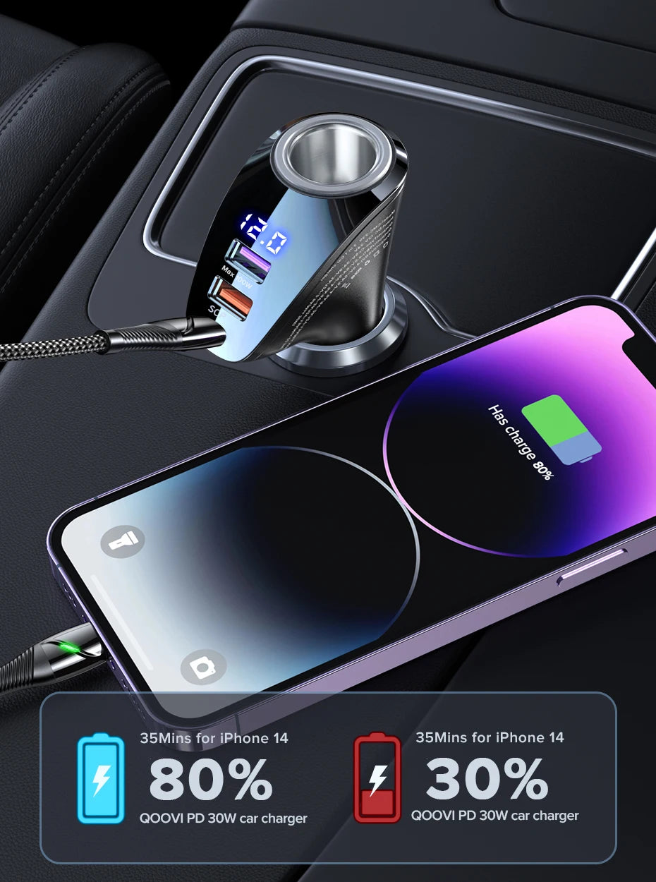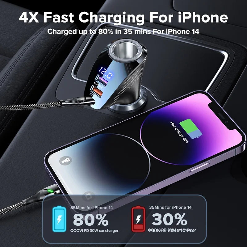 QOOVI 150W 4-Ports Car Charger USB Type C Super Fast Charging PD 4.0 Cigarette Lighter Socket For iPhone Xiaomi Samsung Huawei