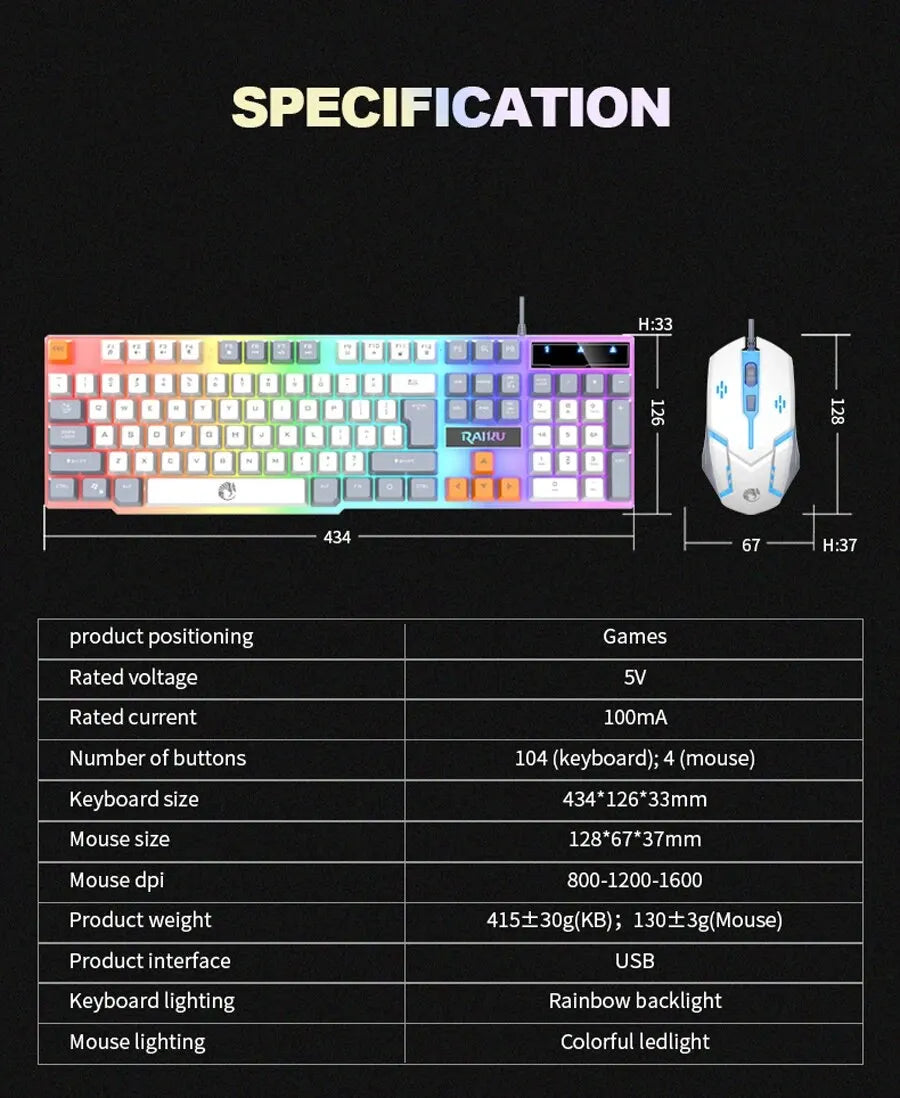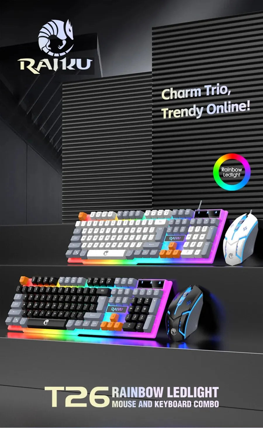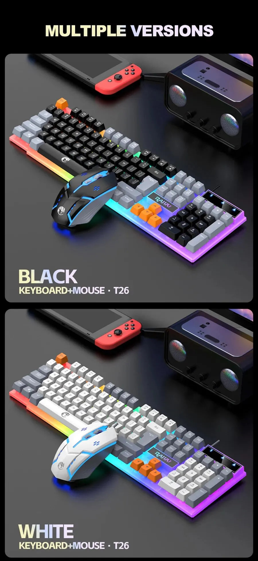 RAIKU T26 Wired 104 Keys Membrane Keyboard And Mouse Suit Kinds of Colorful Lighting Gaming and Office For Windows and IOS