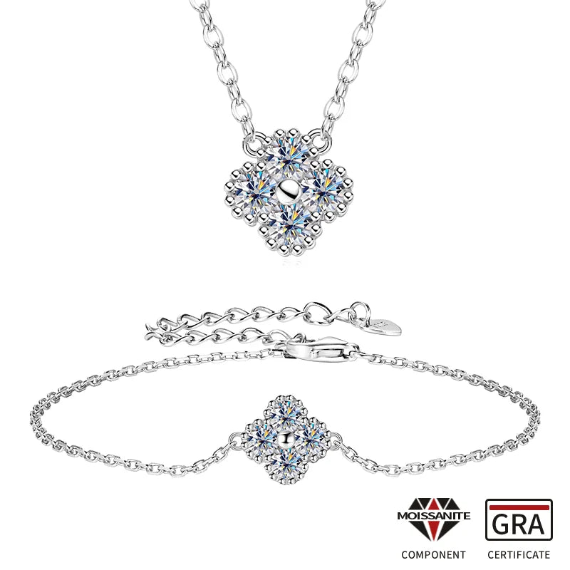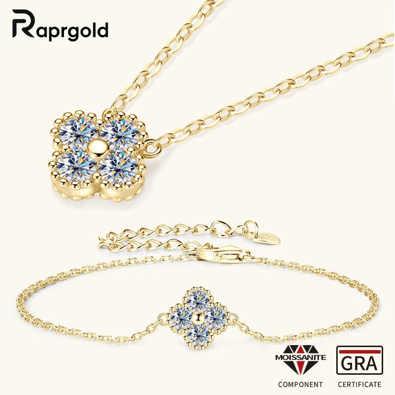 RAPRGOLD GRA Moissanite Four Clover Flower Charm Pendant Necklace Bracelet Set for Women S925 Sterling Silver Fine Jewelry Gifts