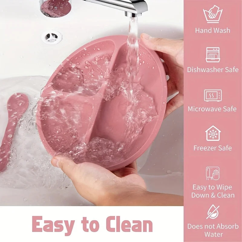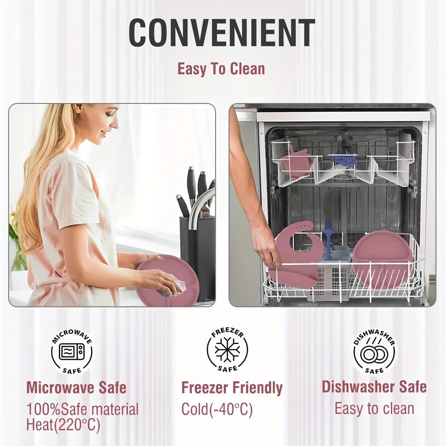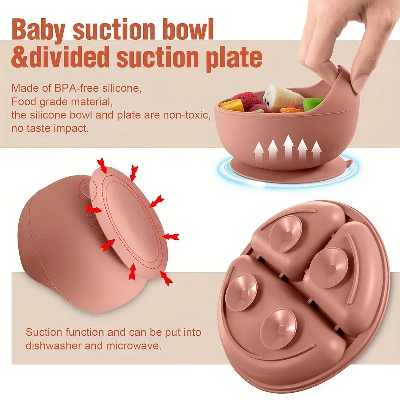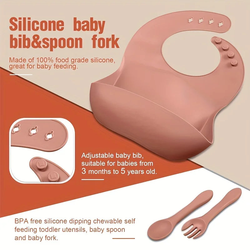 Silicone Baby Feeding Set Microwave Oven Safe for 0-3 Years Includes Suction Plate Soft Bowl Spoons Forks Bib Snack Cup