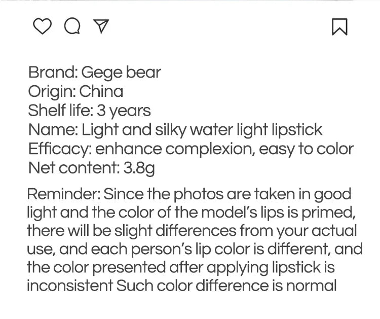 Silky Glossy Lipstick Gege Bear Pump Lips Moisture Water Bomb Comfortable Ultra Sheen Non-Stick Cup Lip Balm